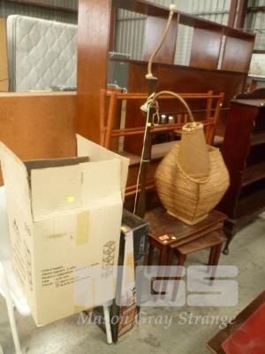 NEST OF 3 TABLES, CLOTHES AIRER, CANE BASKET, STANDARD LAMP, SHOWER CHAIR, COLUMN HEATER, & DRAWER UNIT