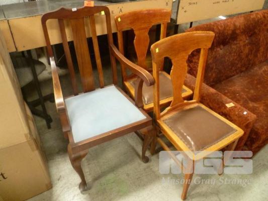 PAIR OAK DINING CHAIRS, BROWN LEATHER INLAY & CARVER CHAIR, CABRIOLE LEGS