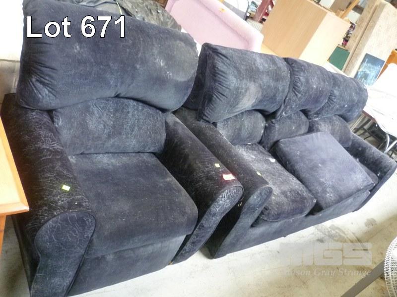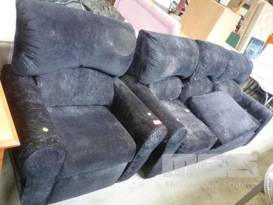 NAVY BLUE FABRIC LOUNGE SUITE COMPRISING THREE SEAT LOUNGE AND RECLINER.