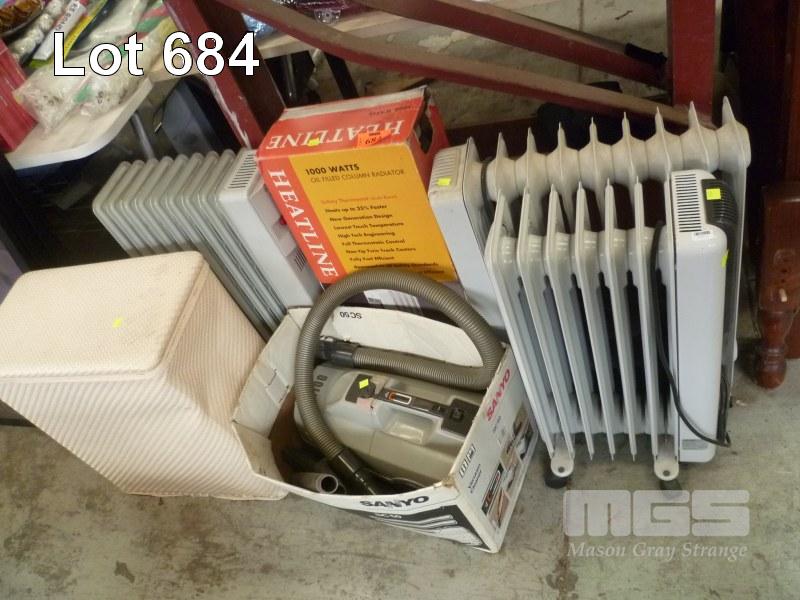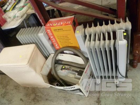 4 x OIL HEATERS, SANYO VACUUM CLEANER & LAUNDRY BASKET