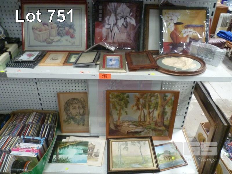 ASSORTED PICTURES & PRINTS IN FRAMES, 2 x SHELVES