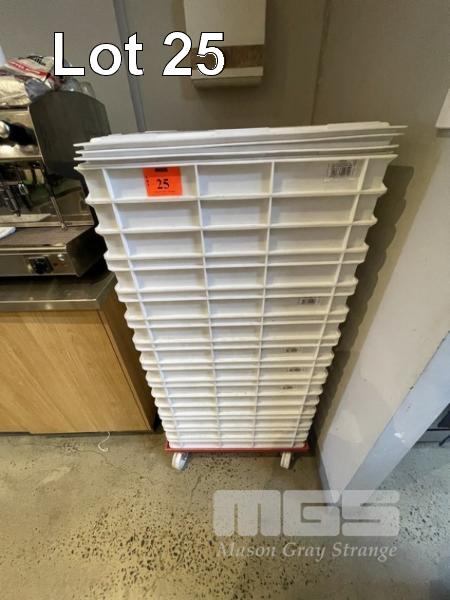 14 x PVC STACKING STORAGE TUBS ON TUB TROLLEY WITH 4 x LIDS