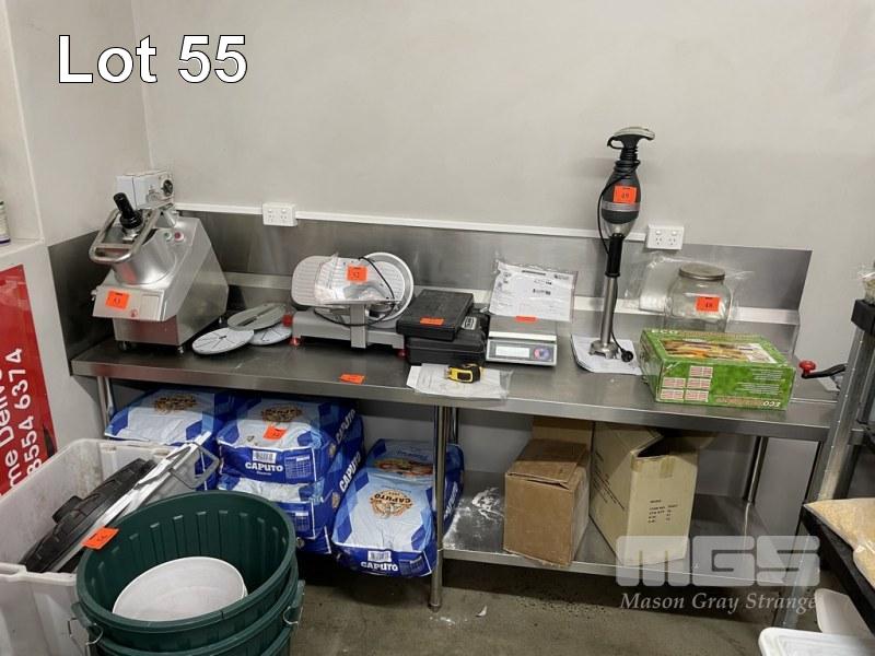 STAINLESS STEEL PREP BENCH, 2 TIER WITH SPLASHBACK 240 x 60cm & BONZER CAN OPENER