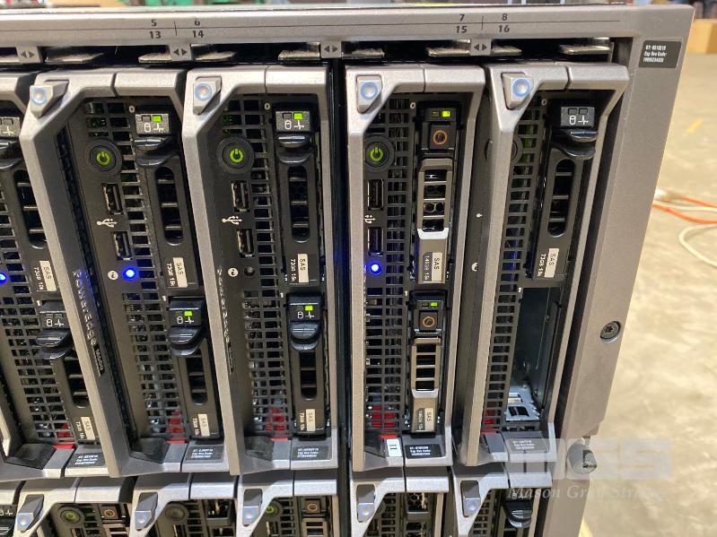DELL POWEREDGE M1000e ENCLOSURE WITH 16 x DELL POWEREDGE BLADE SERVERS - DELL POWEREDGE M710HD, 2 x XEON X5660 @ 2.8GHz, 128GB RAM, NO HDD - DELL POWEREDGE M600, 2 x XEON E5450 @ 3GHz, 32GB RAM, NO HDD - DELL POWEREDGE M710HD, 2 x XEON X5660 @ 2.8GHz, 128GB RAM, NO HDD - DELL POWEREDGE M600, XEON E5310 @ 1.6GHz, 16GB RAM, 2 x 73GB HDD - DELL POWEREDGE M600, XEOB E5430 @ 2.6GHz, 8GB RAM, 2 x 73GB HDD - DELL POWEREDGE M600, XEON E5430 @ 2.6GHz, 8GB RAM, 2 x 73GB HDD - DELL POWEREDGE M610, 2 x XEON E5640 @ 2.6GHz, 96GB RAM, 2 x 146GB HDD - DELL POWEREDGE M600, 2 x XEON E5450 @ 3GHz, 32GB RAM, 73GB HDD - DELL POWEREDGE M600, 2 x XEON E5450 @ 3GHz, 32GB RAM, 73GB HDD, 146GB HDD - DELL POWEREDGE M610, XEON E5640 @ 2.6GHz, 8GB RAM, 2 x 146GB HDD - DELL POWEREDGE M600, 2 x XEON E5450 @ 3GHz, 32GB RAM, 2 x 146GB HDD - DELL POWEREDGE M710HD, 2 x XEON X5660 @ 2.8GHz, 128GB RAM, 2 x 146GB HDD - DELL POWEREDGE M710HD, 2 x XEON X5660 @ 2.8GHz, 128GB RAM, NO HDD - DELL POWEREDGE M610, XEON E5640 @ 2.6GHz, 8GB RAM, 2 x 146GB HDD - DELL POWEREDGE M710HD, 2 x XEON X5660 @ 2.8GHz, 128GB RAM, NO HDD - DELL POWEREDGE M600, XEON E5310 @ 1.6GHz, 16GB RAM, 2 x 73GB HDD (NO CABLES) S/N:9513X1S