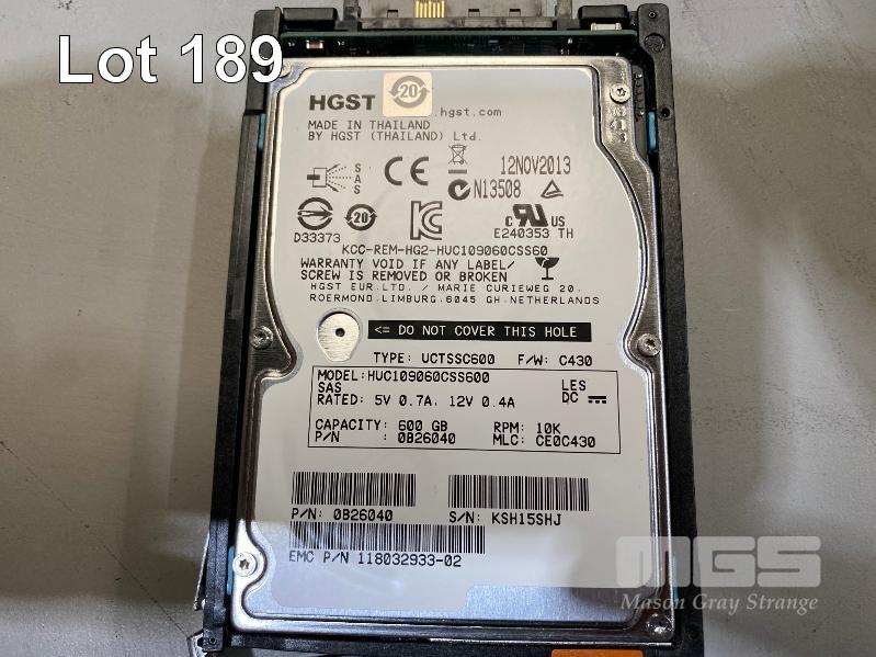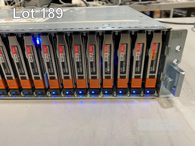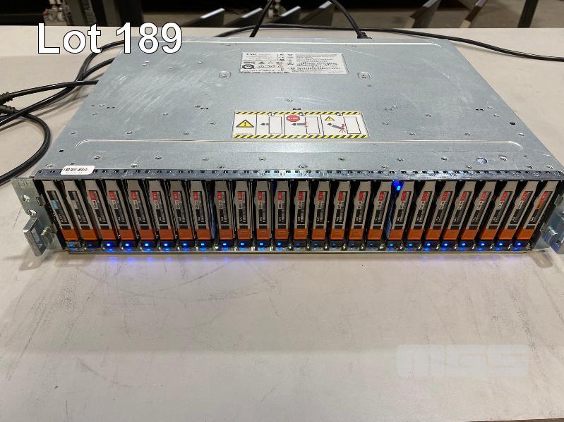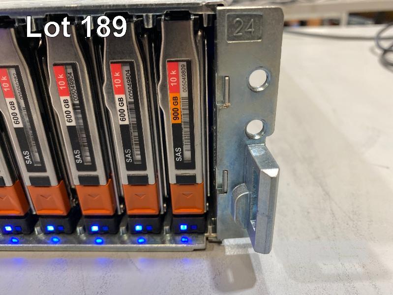 RACKMOUNT STORAGE DISK ARRAY ENCLOUSRE, EMC, MODEL SAE, 2U, WITH 1 x 900GB SAS HDD, 22 x 600GB SAS HDD, 1 x 200GB FLASH HDD, 1 x 100GB FLASH HDD, 2 x 6GB SAS LCC CONTROLLER CARDS (303-104-000E), 2 x 400W PSU (071-000-541) (NO CABLES) S/N:JWXED133901893, JWXEC133901399