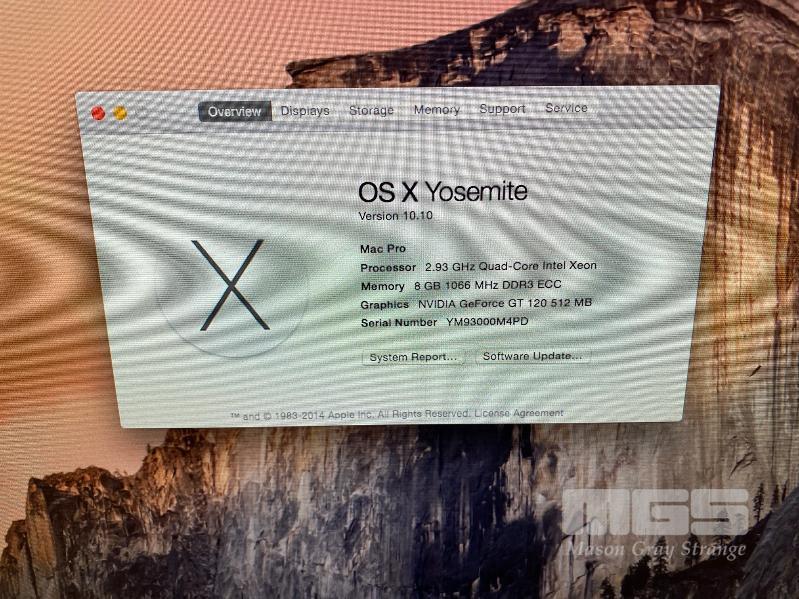 TOWER PC, APPLE MAC PRO (A1289), XEON W3540 @ 2.93GHz, 8GB DDR3 ECC RAM, 2TB SATA HDD, DVD-RW, 512MB NVIDIA GEFORCE GT 120 VIDEO, MAC OS 10.10 INSTALLED (NO KEYBOARD, NO MOUSE, NO APPLE POWER CORD) S/N:YM93000M4PD