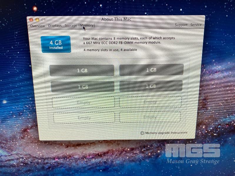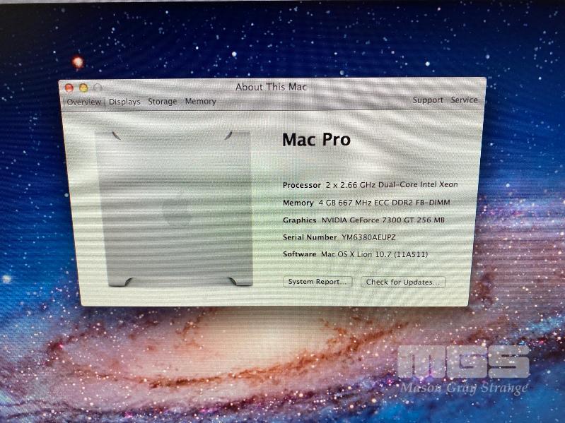 TOWER PC, APPLE MAC PRO (A1186), 2 x XEON 5150 @ 2.66GHz, 4GB ECC DDR2 RAM, 250GB SATA HDD, DVD-RW, 256MB NVIDIA GEFORCE 7300 GT VIDEO, MAC OS 10.7 INSTALLED (NO KEYBOARD, NO MOUSE, NO APPLE POWER CORD) S/N:YM6380AEUPZ
