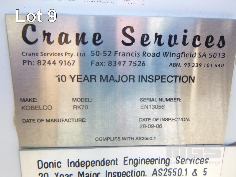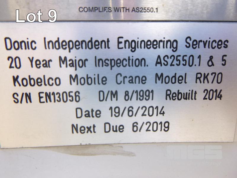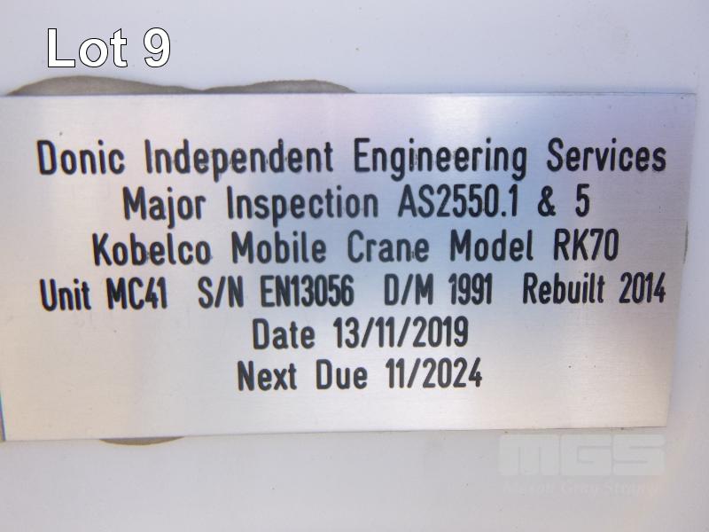 1991 KOBELCO AT-RK70 YARD CARRY CRANE REG: HPS 364 ODO: 155,946kms SHOWING HOURS: 887hours 4 CYLINDER ISUZU DIESEL, 4 SPEED AUTOMATIC TRANSMISSION, S/NO: EN13056 7 TONNE CAPACITY MAJOR INSPECTION DUE: 11/2024 KEY #17