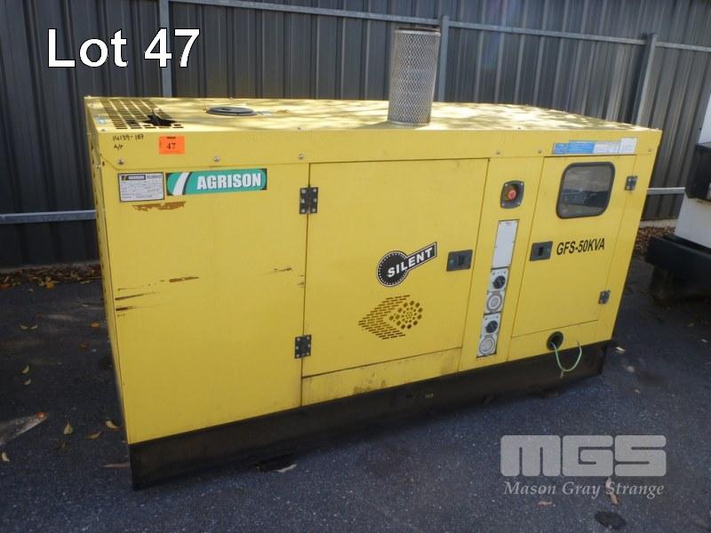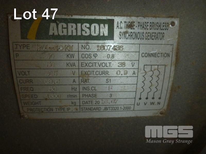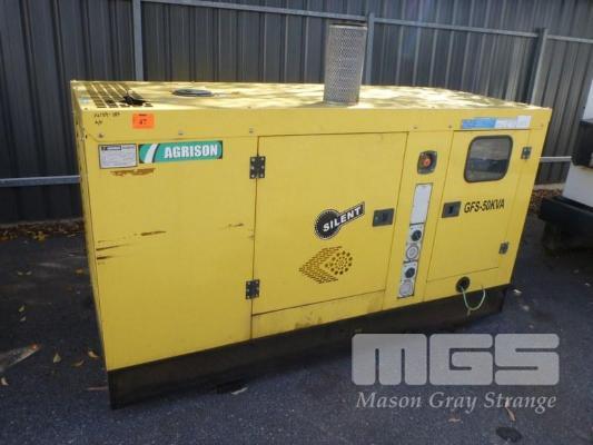 SILENCED PACKAGED GENERATOR, ALL FAULTS, AGRISON TYPE: GFS-50KVA S/NO: 1607767 DOM: 7/16 50KVA MAX OUTPUT 415V/240V 4 CYLINDER WF DIESEL TH SERIES E-STOP 220 x 85 x 127cm (H)