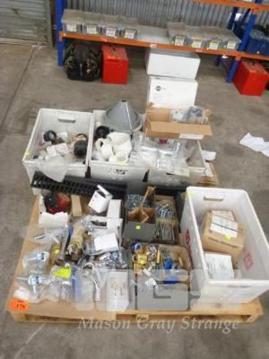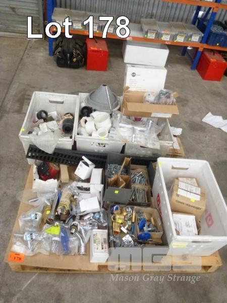 ASSORTED PLUMBING SUPPLIES INC TAPES, PVC FITTINGS, GRUNDFOS PUMP, PADLOCKS & INSINKERATOR, 1 x PALLET