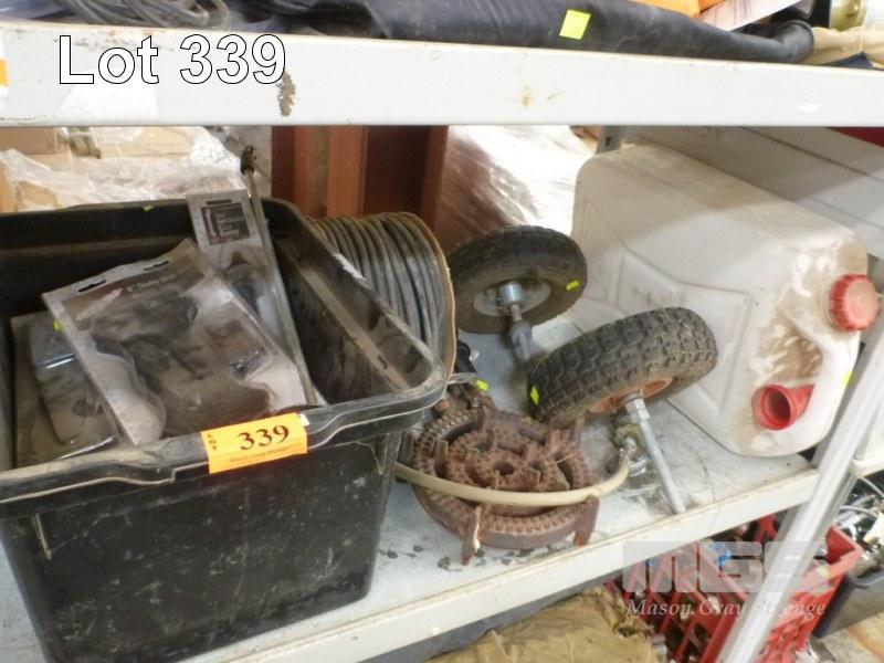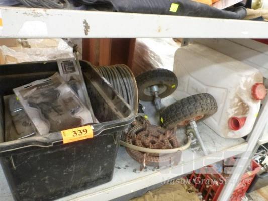 ASSORTED GATE SPRINGS, HINGES, RING BURNER, SHOCK CORD, 20 LITRE JERRY CAN & 2 x SACK TRUCK WHEELS