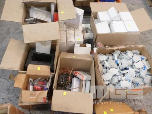 ASSORTED ELECTCIAL COMPONENTS INCLUDING CIRCUIT BREAKERS, RELAYS, CONEC LINK 4490 INTERFACES, 25 x UNIVERSITY MOD: SP-58 CURRENT TRANSFORMERS, FUSES, ETC 1 x PALLET
