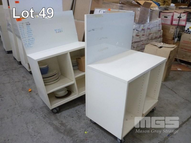 2 x MOBILE SHELF UNITS WITH MAGNETIC BACKBOARD, 50 x 80 x 120cm (H), WHITE LAMINATE