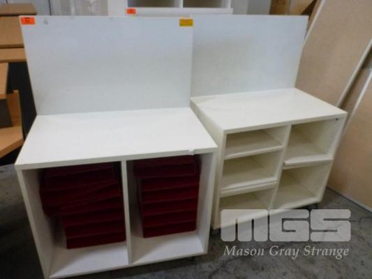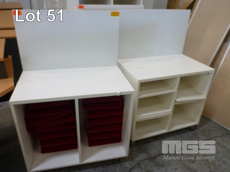 2 x MOBILE SHELF UNITS WITH MAGNETIC BACKBOARD, 50 x 80 x 120cm (H), WHITE LAMINATE