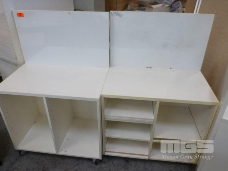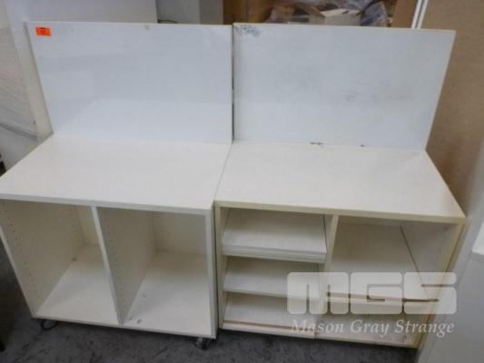 2 x MOBILE SHELF UNITS WITH MAGNETIC BACKBOARD, 50 x 80 x 120cm (H), WHITE LAMINATE