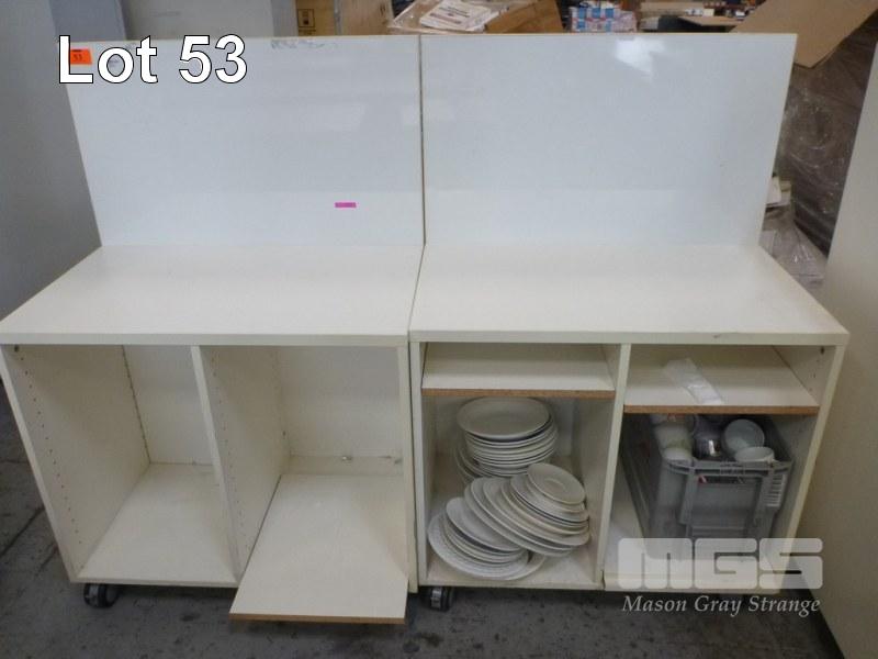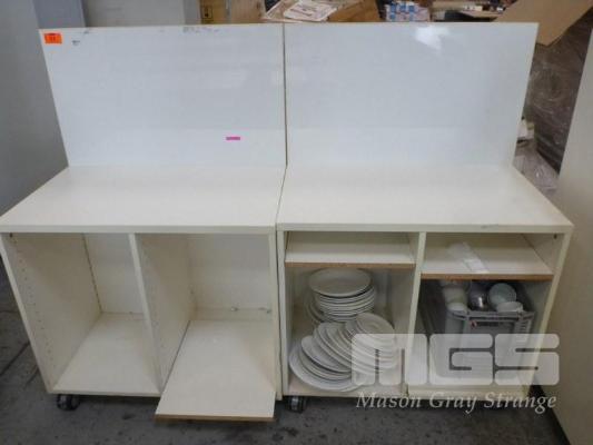 2 x MOBILE SHELF UNITS WITH MAGNETIC BACKBOARD, 50 x 80 x 120cm (H), WHITE LAMINATE