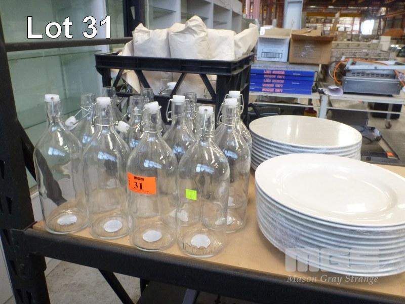 25 x WATER BOTTLES, 1 LITRE & 20 WHITE PLATES, 30CM
