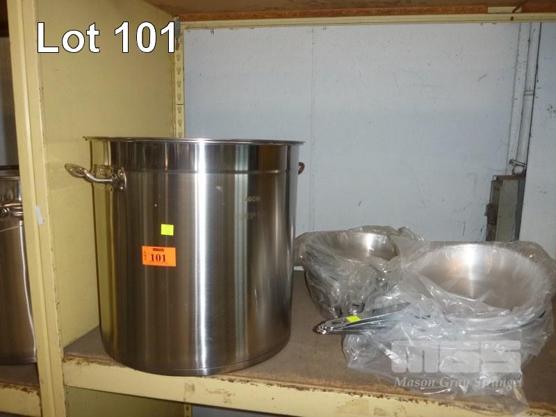 STAINLESS STEEL STOCK POT, 45cm & 10 x FRY PANS, 30 & 26cm