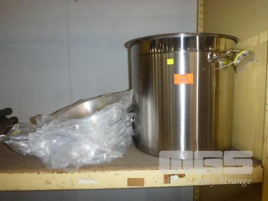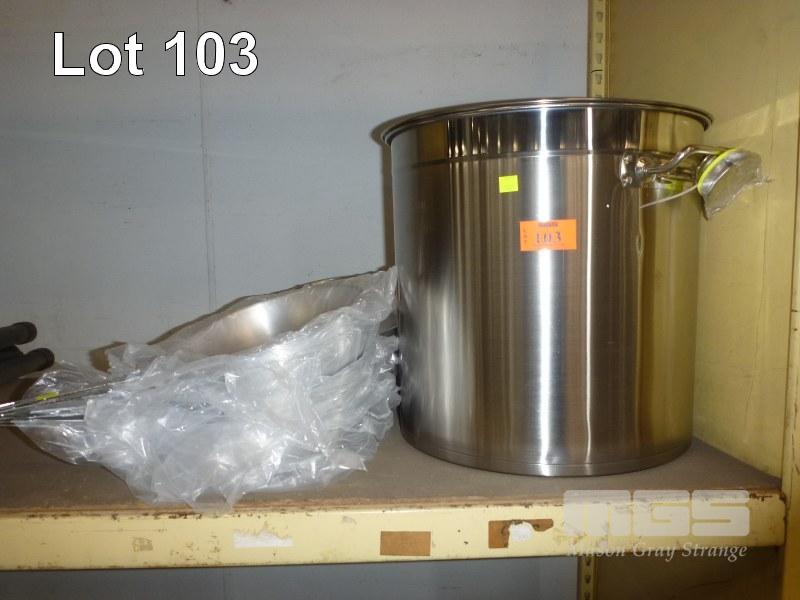 STAINLESS STEEL STOCK POT, 45cm & 10 x FRY PANS, 30 & 26cm