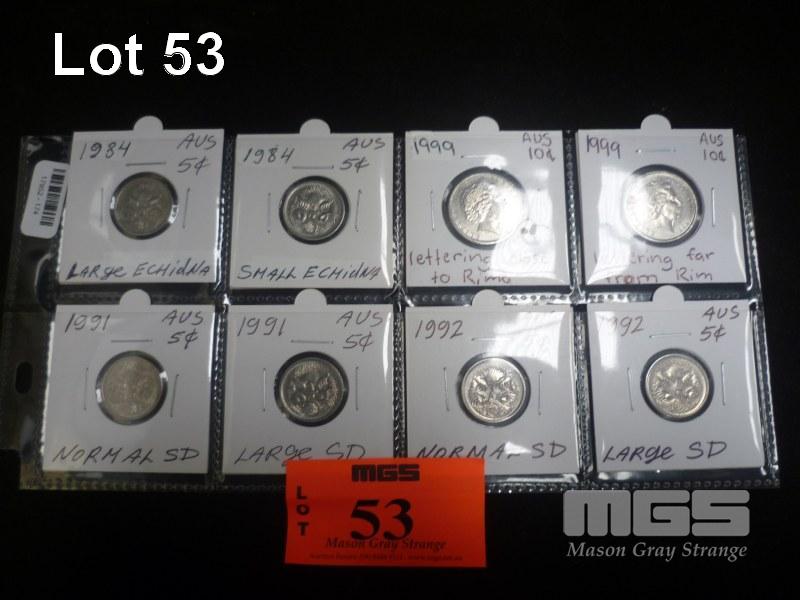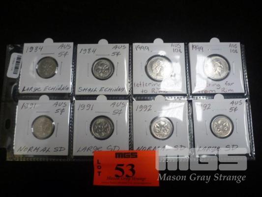 8 x AUSTRALIA 5c & 10c COINS, INC; LARGE ECHIDNA, SMALL ECHIDNA, LETTERING CLOSE TO RIM, LETTERING FAR FROM RIM, NORMAL SD, LARGE SD