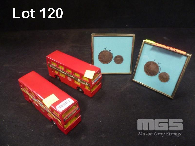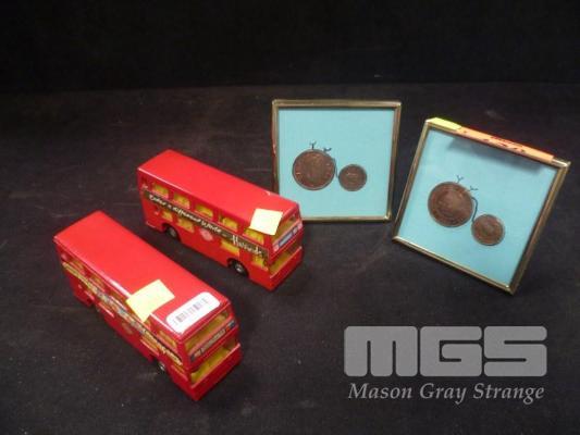2 x OLD LONDON DOUBLE DECKER BUS MODELS & 2 x FRAMED PENNY FARTHINGS COIN DISPLAYS