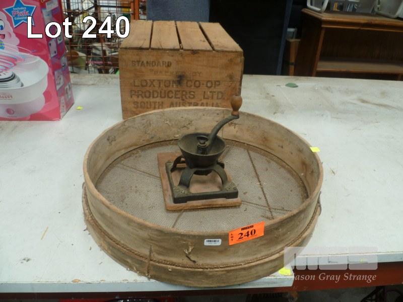 VINTAGE COFFEE GRINDER, SIEVE & LOXTON CO-OP PRODUCE BOX