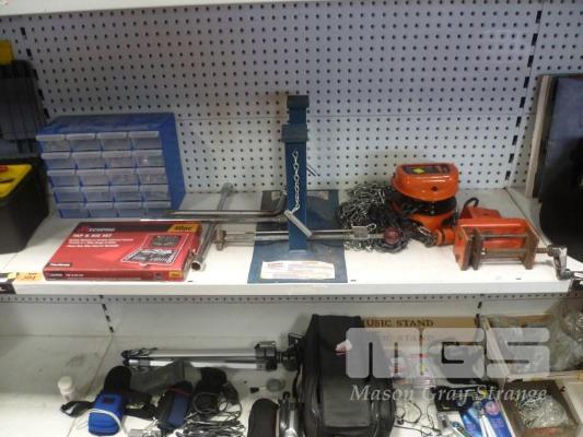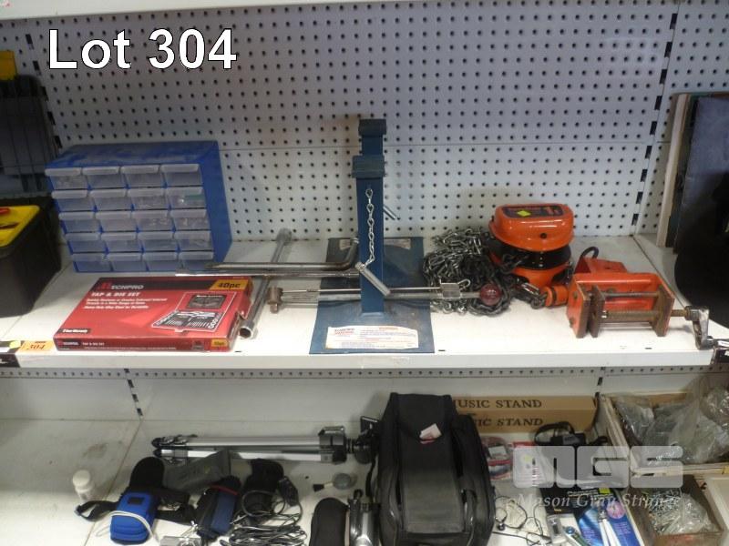 TRADE TOOLS, 1 TONNE CHAIN BLOCK & TACKLE, 3 WAY PORTABLE VICE, JACK STANDS, TORQUE WRENCH, TAP & DIE SET, SMALL PARTS DRAWERS & CONTENTS