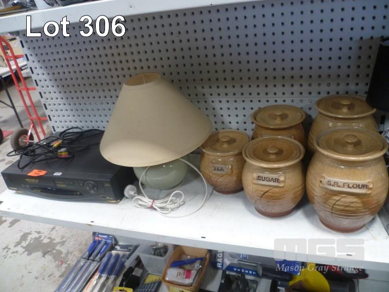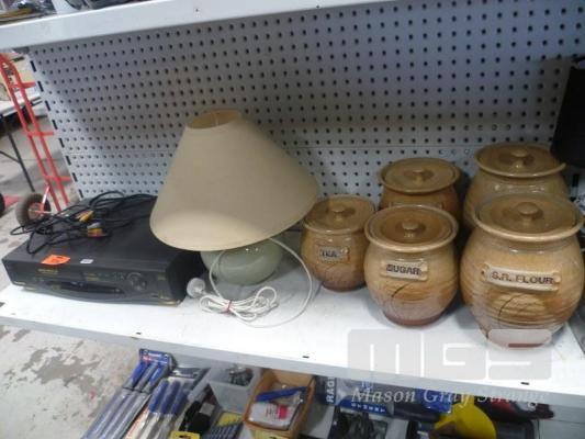 PANASONIC VHS PLAYER, TABLE LAMP & POTTERY CANISTERS