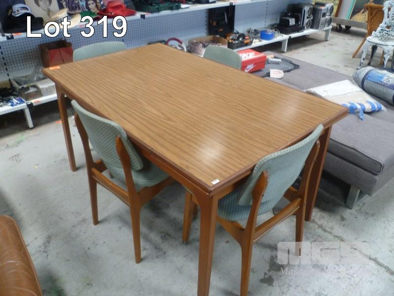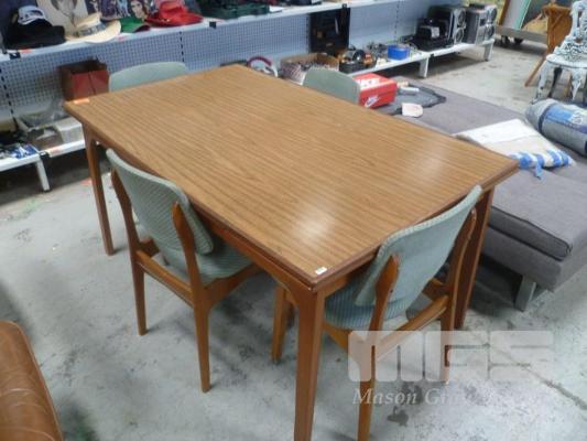 DINING SUITE COMPRISING WOODGRAIN LAMINATE TABLE WITH 4 x GREEN FABRIC UPHOLSTERED CHAIRS