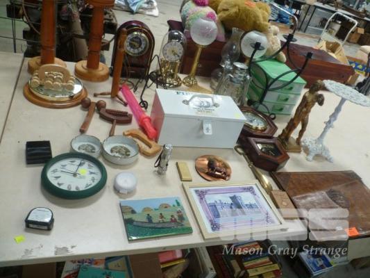 ASSORTED HOMEWARES, CAST POT STAND, TIMBER CASED PENDULUM WALL CLOCK, DOME CLOCK, FIRST AID KIT, ETC