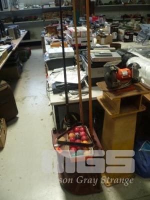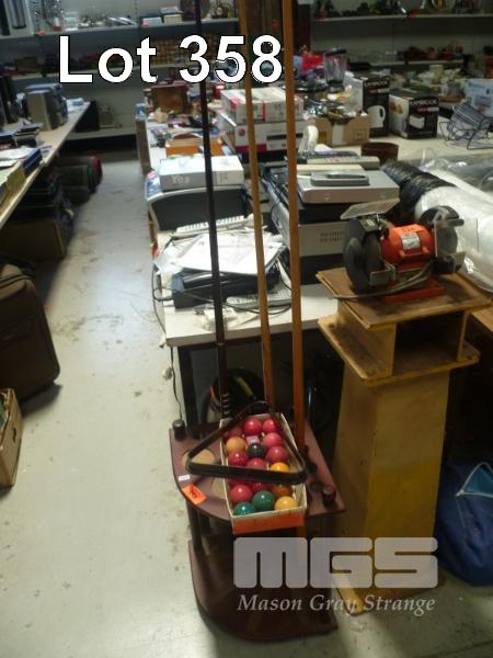 POOL CUE STAND WITH BILLIARD CUES, BALLS & ACCESSORIES