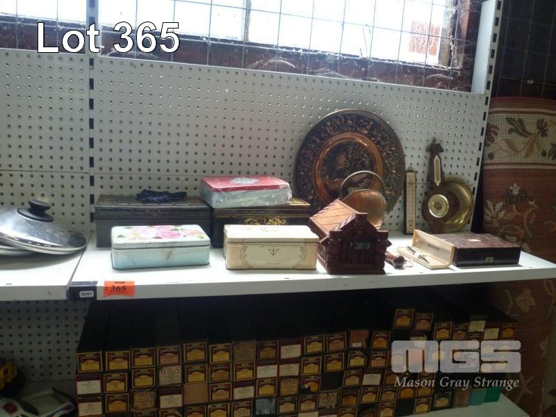 ASSORTED VINTAGE TINS, COPPER ART, BAROMETER & THERMOMETER, ETC