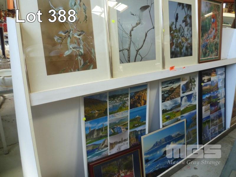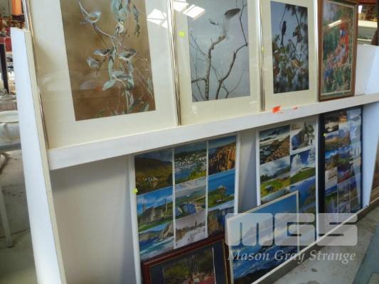 4 x BIRD RELATED PICTURES, (1 x GLASS ALL FAULTS), 1 x SHELF