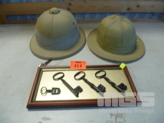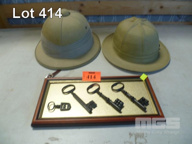 DORBIAN PITH HAT & OTHER WITH VINTAGE KEYS MOUNTED ON BOARD