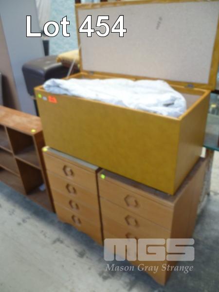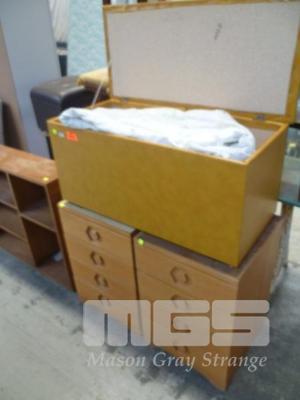 VINYL UPHOLSTERED BLANKET BOX, 2 x DRAWER UNITS & HALF HEIGHT BOOKCASE
