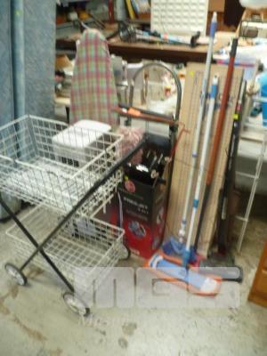 HOOVER STICK VAC, PORTABLE COOLER, LAUNDRY TROLLEY, IRONING BOARD, CLEANING EQUIPMENT, ETC