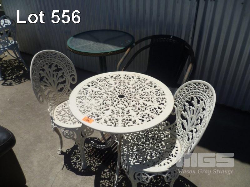 WHITE PAINTED ALUMINIUM 3 PIECE OUT DOOR SETTING, INCLUDING; ROUND TABLE & 2 x CHAIRS