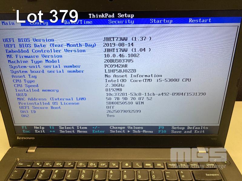 LAPTOP, LENOVO THINKPAD T450 (20BUS03705), CORE i5 5300U (5TH GEN) @ 2.3GHz, 8GB DDR3 RAM, 500GB SATA HDD, 14" WIDESCREEN & POWER SUPPLY (NOTE: BIOS PASSWORD PROTECTED) S/N:PC094ZAR