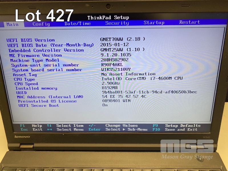 LAPTOP, LENOVO THINKPAD W540 (20BHS02902), CORE i7 4600M (4TH GEN) @ 2.9GHz, 8GB DDR3 RAM, 500GB SATA HDD, DVD-RW, 15.6" WIDESCREEN (1920x1080), INTEL HD VIDEO, 2GB NVIDIA QUADRO K1100M VIDEO, Wi-Fi, BLUETOOTH, WINDOWS 10 PRO INSTALLED & POWER SUPPLY (NOTE: MARKS ON SCREEN) S/N:R90F4AKL