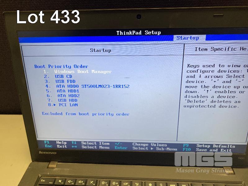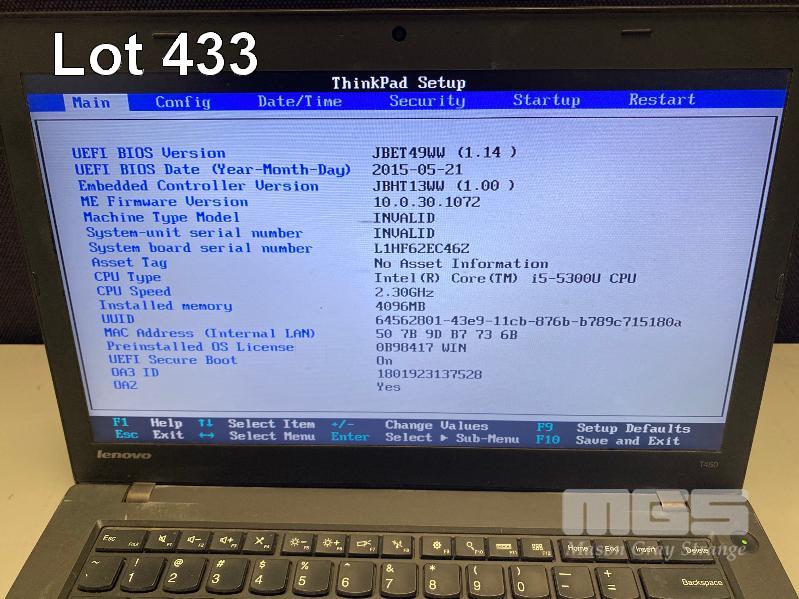 LAPTOP, LENOVO THINKPAD T450 (20BUS03705), CORE i5 5300U (5TH GEN) @ 2.3GHz, 4GB DDR3 RAM, 500GB SATA HDD, 14" WIDESCREEN (1366x768), INTEL HD VIDEO, Wi-Fi, BLUETOOTH, WINDOWS 10 PRO INSTALLED & POWER SUPPLY (NOTE: TOUCHPAD WORN, MARKS ON SCREEN, MESSAGE ON STARTUP "MACHINE TYPE AND SERIAL NUMBER ARE INVALID") S/N:PC08ZJ3E