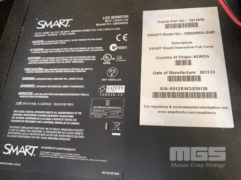MONITOR, SMART 55" LCD, MODEL SBID8055i, SMART BOARD INTERACTIVE FLAT PANEL (NOTE: FAULTY, POWERS ON, NO DISPLAY TO SCREEN, NO REMOTE)