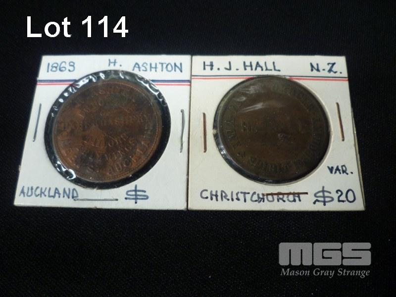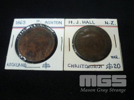 1863, M.ASHTON, QUEEN ST AUCKLAND PENNY TOKEN, IMPORTER OF HABERDASHERY & TAILORS TRIMMINGS HJ HALL, CHRISTCHURCH COFFEE MILLS TOKEN, FAMILY GROCER-WINE & SPIRIT MERCHANTS