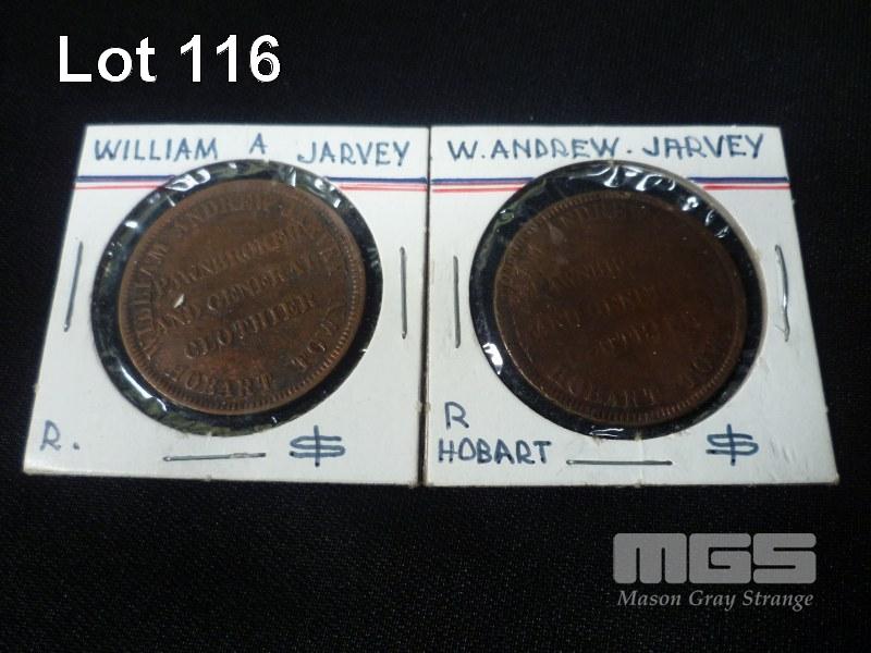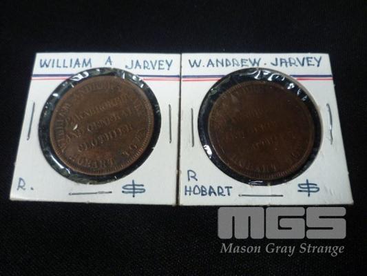 2 X PENNY TOKENS, WILLIAM ANDREW JARVEY, HOBART TOWN, PRAWNBROKER AND GENERAL CLOTHIER
