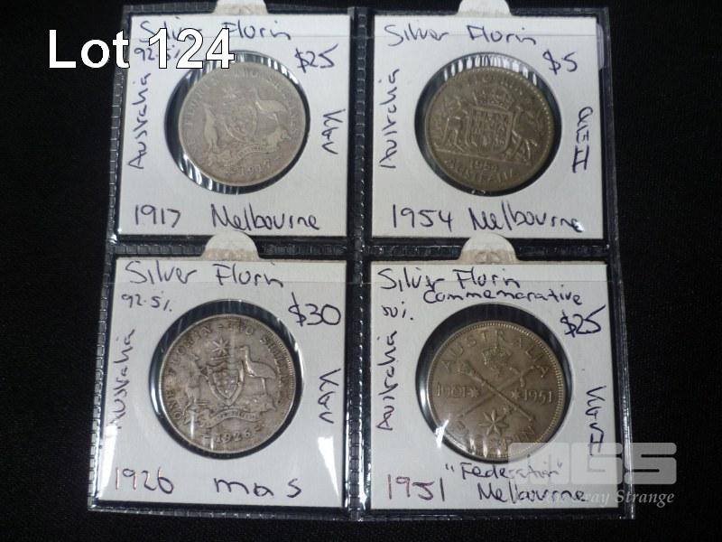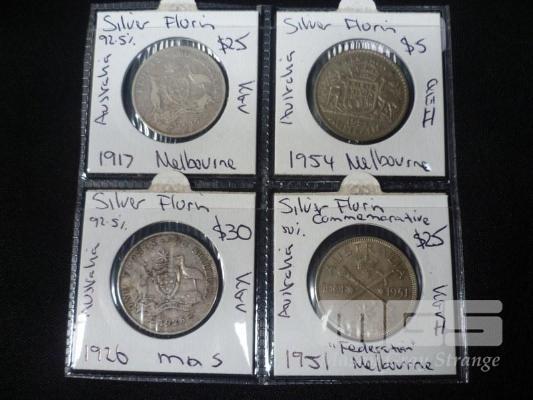 COLLECTION OF FLORINS 1914/51/57/58 MIXED GRADES 4 COINS