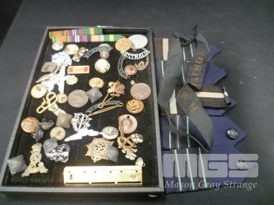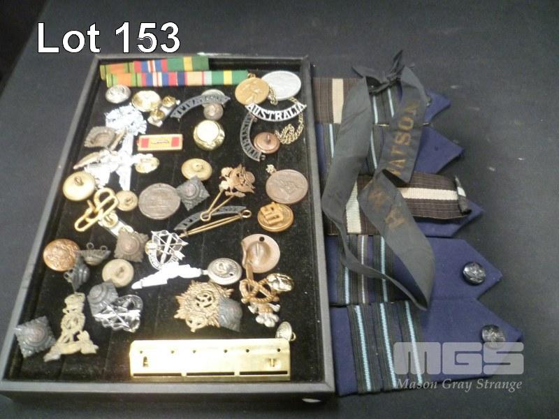 ASSORTED MILITARY, BADGES, PINS, BUTTONS, BARS, ETC
