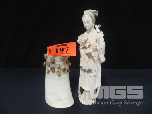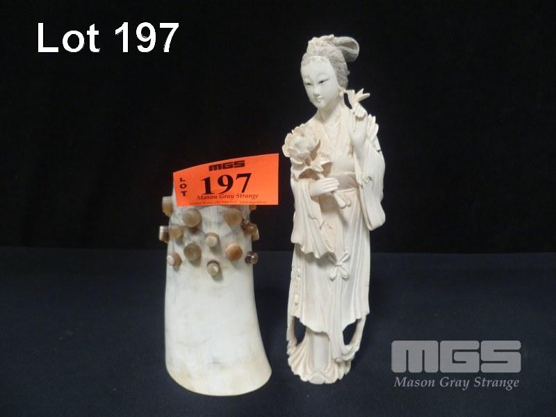 CARVED ORIENTAL STYLE BONE ORNAMENT & DECORATED HORN