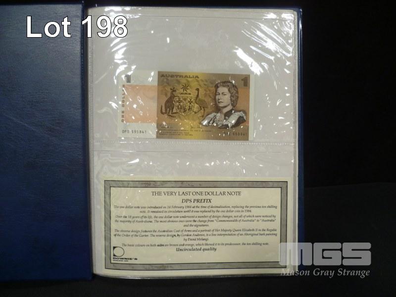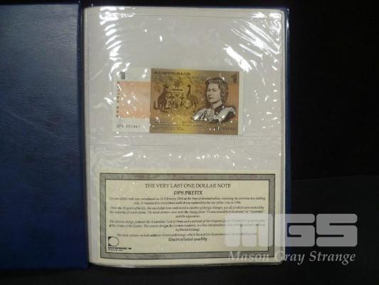 BANKNOTE ALBUM CONTAINING 3 AUSTRALIA, UNCIRCULATED, PAPER BANKNOTES, LAST PREFIX $1 DPS 695841 LAST $2 LQG 853077 LAST $5 QPG 843688
