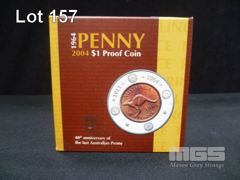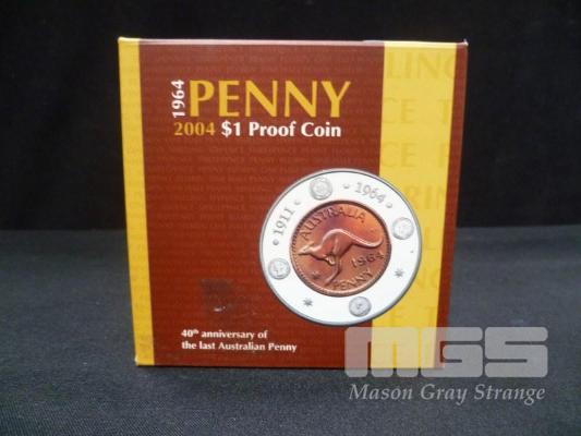 ROYAL AUSTRALIAN MINT, 1964 PENNY, 2004 $1 PROOF COIN, '40th ANNIVERSARY OF THE LAST AUSTRALIAN PENNY' #2968