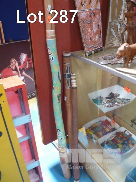 3 x HAND PAINTED TIMBER DIDGERIDOOS, 89, 100 & 131cm (L)