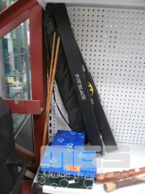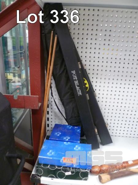 5 x POOL CUES, 2 PIECE COMPETITION INC SATURN, BATMAN, POT BLACK, ETC & 3 x BOXES BALLS